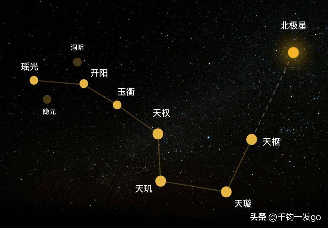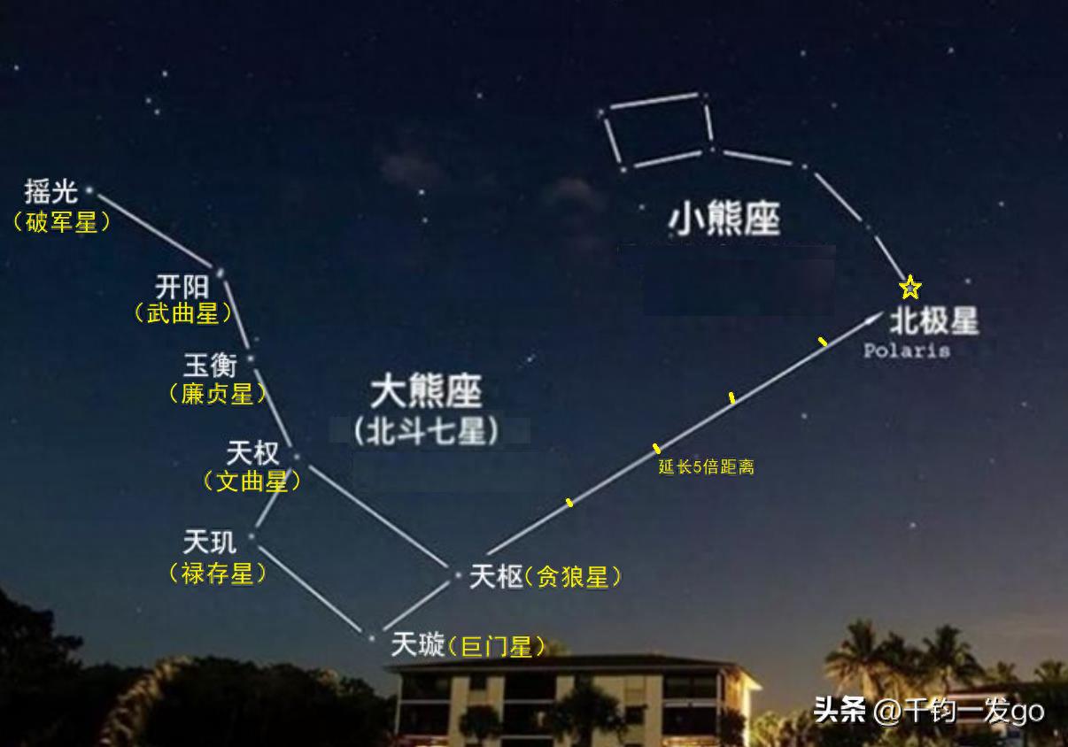 北斗七星属于大熊座的一部分,位于大熊座的尾部。将斗口的两颗星(天枢和天璇)连线并朝斗口方向延长约5倍距离,就找到了北极星。