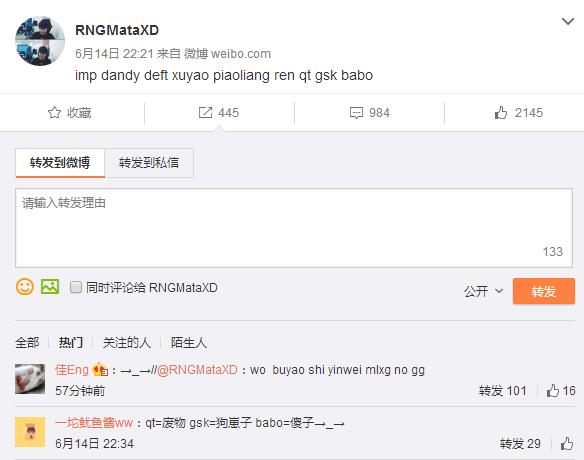 mata在微博为三星好友征婚:微博内容为:imp dandy deft需要漂亮妹子!(qt gsk babo是骂人的话,专门为调侃用)重点是mata的一条转发:我不要是因为mlxg no gg!两人在背后究竟有什么朋友交易?是no gg还是no jj?……加入搞事boys的mata,搞事实力也是不容小觑!