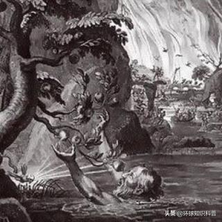 他站在一个池塘的中央,湖水触动着他的下巴颏儿,但他却忍受着嗓眼冒火似的焦渴,池水就在嘴边却一滴也喝不到。每当他低头,贪婪地想让嘴接近水,水就在他眼前消失,池塘干涸,黑土地在他脚下出现。好像有一个妖魔把池塘变干了。同时他还忍受着难熬的饥饿。他身后的湖岸上有美丽的果树茂盛地生长,树枝垂在他的头顶。每当他挺起身来,多汁的梨,鲜红的苹果,火红的石榴,芬芳的无花果和绿色的橄榄便笑盈盈地映入他的眼帘。但他伸手想抓住它们时,一股骤起的大风就把树枝刮到云端。与他这种巨大痛苦相伴的,是永不间断的对死的恐惧,因为有一块巨石悬在他的头顶,随时都可能掉下来压在他身上。这样,这个蔑视神的凶恶的坦塔罗斯,就命中注定要在地狱里身受这永无终止的三种苦刑。