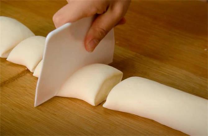 2.时间差不多到了,取出来面团不用揉,直接整理成长筒,下大小均匀的面剂。