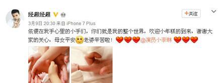 晚上,经超发微博和大家一起分享得女的喜悦,依偎在手心里的小手们,你们就是我的整个世界,欢迎小年糕的到来,谢谢大家的关心,母女平安。而在接受采访的时候,经超已经透露尚未给女儿取名字,虽然大女儿想要叫妹妹“九儿”,但是还需要等老婆稍微好一点之后一起商量。而经超的大女儿则是小李琳之前和前夫所生的女儿,现跟随经超和小李琳一起生活,一家人的感情很好。