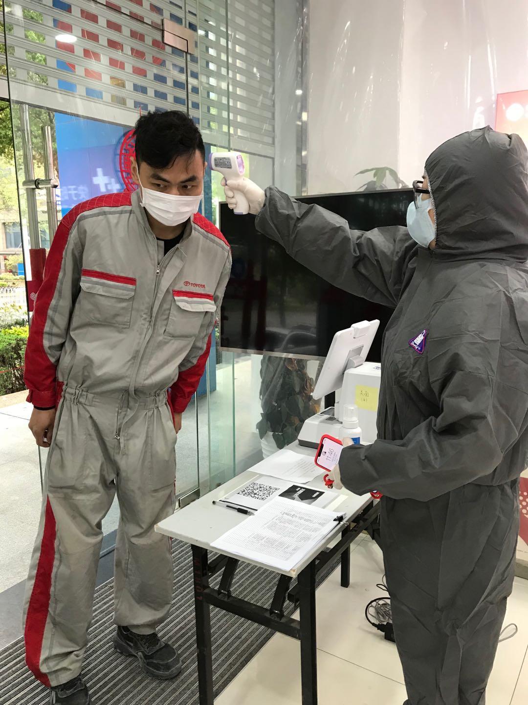 (武汉移动营业厅工作人员为客户测量体温)