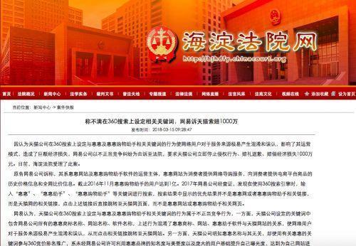 上过惠惠网吗? 惠惠网站及惠惠购物助手软件的运营主体是网易。据海淀法院网3月15日消息显示,网易经查证发现,在使用360搜索输入“惠惠”、“惠惠助手”、“惠惠购物助手”等关键词进时,搜索结果中显示的优先结果并不是惠惠网等相关链接,而是天猫网的相关链接,点击上述链接后还会直接跳转至天猫网页面。为此,网易起诉天猫不正当竞争并索赔1000万元 。日前,海淀法院受理了此案。