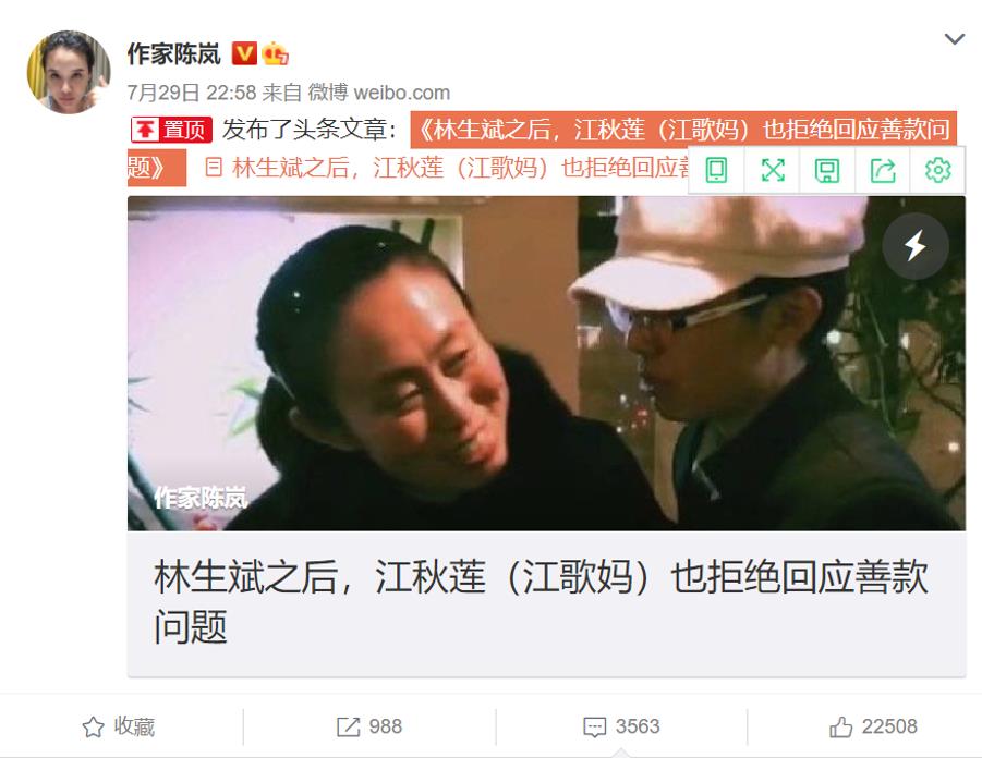 不过作家陈岚似乎更爱热点事情。这次不是她第一次在热点事件中疯狂站队,冲锋陷阵了。可以说是,她活跃在网络各大热点事件之中。她微博的置顶文章是《林生斌之后,江秋莲(江歌妈)也拒绝回应善款问题》。