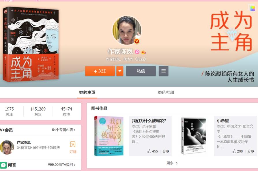 从微博主页来看,陈岚确实是一个作家,微博上都挂着自己的图书作品。