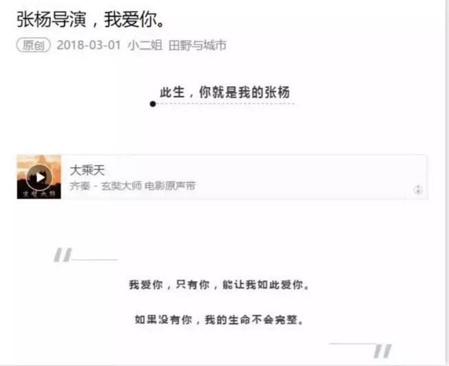 事实证明,要毁灭一个导演,不需要一部接一部花钱拍烂片,只需一篇10万+的微信推文!昨天,一篇名叫《张杨导演,我爱你》的微信推文传遍整个互联网,瞬间就成了朋友圈的热点: