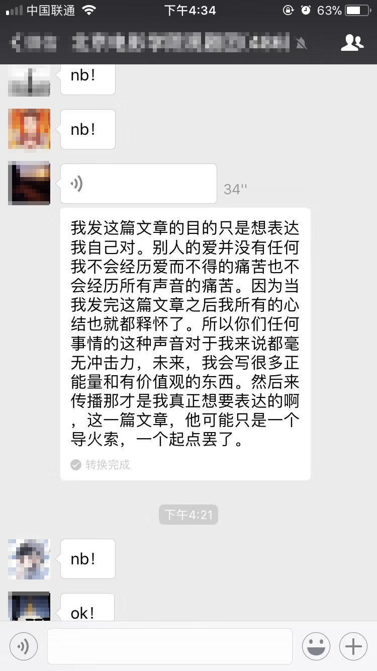 该文章发出后立刻成为网络爆款,凤凰网娱乐独家获得女方朋友圈截图,该名女网友称:“我们已经一个月没联系了,我不想破坏他的家庭,可是我还是想告诉他,我爱他。”