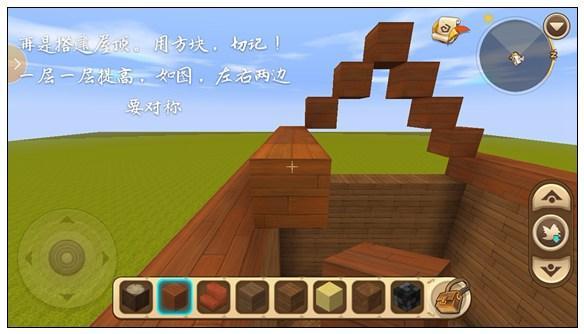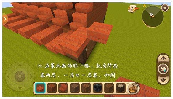 接着是搭建屋顶,用方块如下图一层一层提高,做成阶梯状,左右两边要对称。
