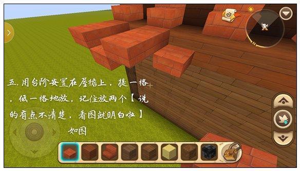 在屋檐最边上的那一格,把台阶提高2层,一层比一层高!