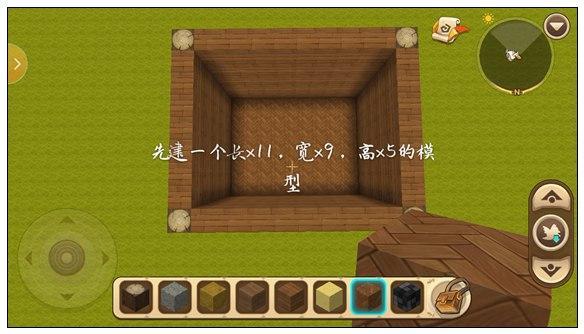 首先用木板和木头建一个长11宽9高5的盒子模型,四个角用原木搭;