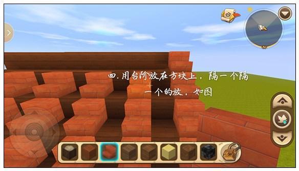 然后是装饰屋顶,用台阶放在屋顶上,一排一排之间空一排地放,如下图。