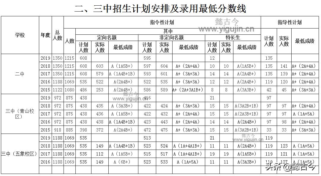 目标是考入南宁二中和三中的童鞋们,那么非常有必要了解近几年来这两所重点高中的计划招生人数、实际招生人数及录取最低成绩等情况,下面分享 2015 年、2016 年、2017 年、2018 年实际招生人数及录取最低成绩和 2019 年招生计划人数,具体见下表: