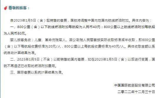 自 2023 年 1 月 5 日(含)起销售的客票,800 公里(含)以下航线燃油附加费每航段为人民币 40 元;800 公里以上航线燃油附加费每航段为人民币 80 元。