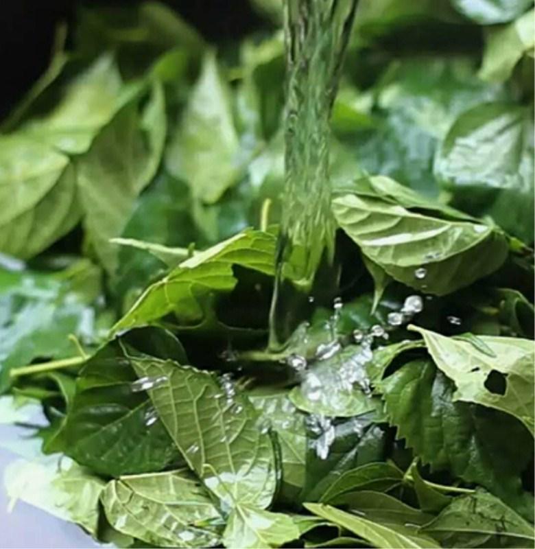 2;洗净后连同叶子兑开水,开水刚好淹没叶子为准,用棍子搅碎斑鸠叶,直到与水融合。