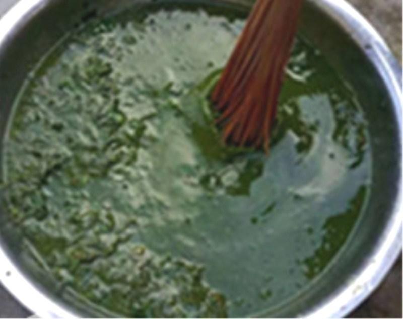 4.取配好的柏树灰,灰水要先用纱布过滤掉泥沙的。融入斑鸠叶水中,充分搅拌。
