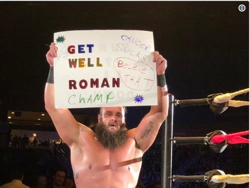 同样,在罗曼雷恩斯因为血癌暂离擂台的同时,WWE后台选手都对罗曼雷恩斯纷纷发来祝福,期望他早日康复回归擂台。今天,WWE现场秀中,罗曼雷恩斯一直以来的对手黑羊布朗斯图曼也公开举牌子,为罗曼雷恩斯送上祝福。