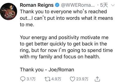 他在接受治疗之前也曾在社交媒体上向一直支持他的粉丝和家人表示感谢,罗曼雷恩斯说:“谢谢所有人的支持,我不知该怎么表达这对我来说的意义,你们的能量和积极让我会更快的恢复,以便回归擂台。但现在我只能花更多的时间和家人在一起,并且关注自身的健康了。”
