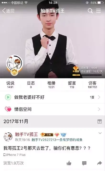 近日,有王者荣耀国服最强刘禅称号的主播孤王猝死的事情传得沸沸扬扬,到目前为止,主播已经有10多天没有直播。11月7号,孤王的QQ上出现一个自称是孤王的弟弟发消息称孤王已于2号猝死。