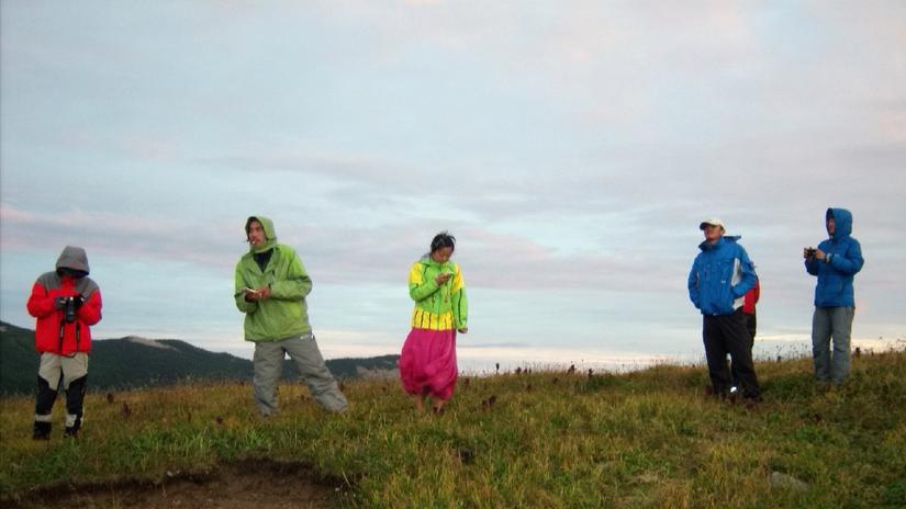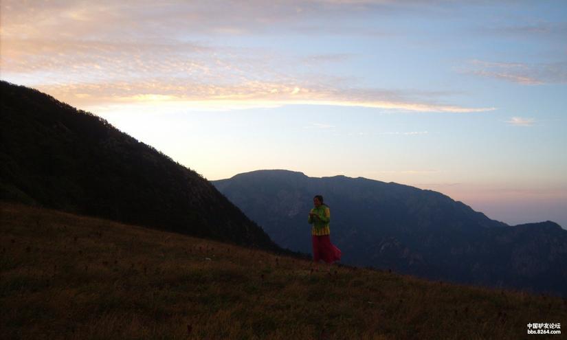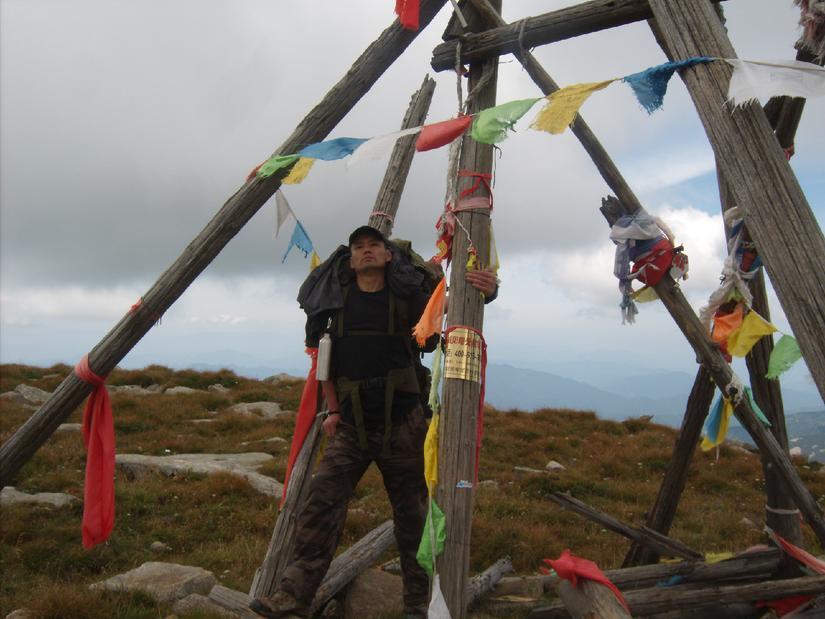 继续一个人追赶前队,这时候每天的雾按时上来了,拔高到万先峰,几乎一马平川的跑马梁,路边有小的尼玛堆,可以指示方向,过雷公庙,远处高点就是拔仙台了,一路慢坡拔高,来到大爷海,放下背包,几个人上到顶峰拔仙台,下来后看天还早,我和飞雪,单眼皮决定再往下走走,他们俩个去下板寺方向,第二天坐车下汤峪口回西安,我到大文公庙一问,走一夜也下不到羊皮沟,想想前队的今夜估计也要到平安寺了吧,我去板房里看了看,住的没有一个我们的人,大都是进山的游客,今晚只好扎营大文公庙。