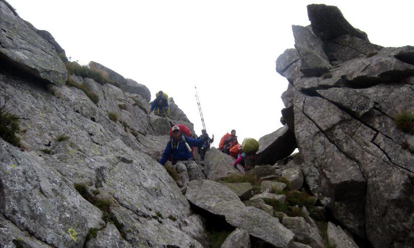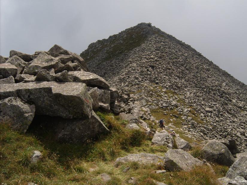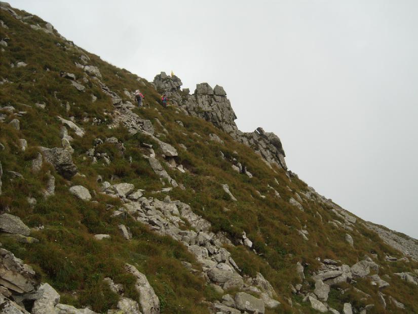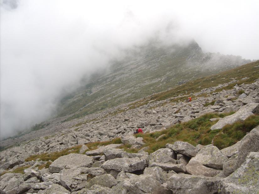 飞机梁和金子塔梁的路,大都在山脊的右侧一方《南坡》,中间有一小段的路,在山脊的左侧一方《北坡》,走不多远,路又切到山脊右侧了,一过中午风和雾都很强,过石海雾大,根本辨不清方向的,凭感觉走就是了,注意脚下的行走痕迹,石海和石海之间,有小路相连,到了梁3顶后,转身发现安徽疯子从后边上来了,纳了闷了我,我们是最后边,一直以为他在前队,原来他胃病犯了,大雾迷了路,恰巧有一队向导带的队伍路过,他就跟着人家上来了,还好一路平安。