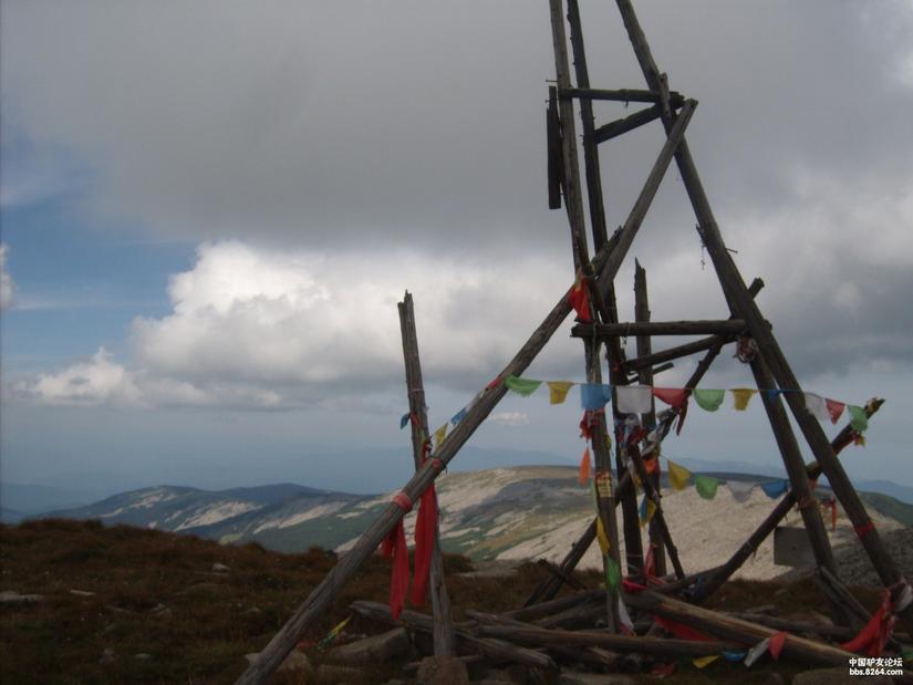 25日晴,天亮自然醒,每个人都把帐篷和睡袋,挂到树上或草甸上嗮装备,吃过早饭整理装备上路。沿着鳌山大梁几乎一路平坦小路,缓慢上坡,盆景园到导航架之间,过一个石头堆切的小庙,有两段几十米高的小的拔高。晴天的话是可以清晰看到导航架的,朝着方向走就是了,爬过一个小的石海,右手平切方向就是导航架方向,导航架前右手是小的尼玛堆,左手前是干涸的水源坑《雨季才会有水》,昨晚511她们三个人,就是在这里扎营的,害的她们今天一天没水喝。
