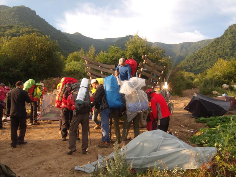24号天气多云,一早6点起床,饭后7点出发,一辆拖拉机刚好装下我们16个人,拉到山前以此下车整理装备《距离3.5公里》,有一队江苏的半夜3点就起程了,他们要三天穿越全程。秀才嘱咐路上注意,昨晚山上走丢一位女驴友,见到的话对讲机通知他一声。告别秀才开始上山。