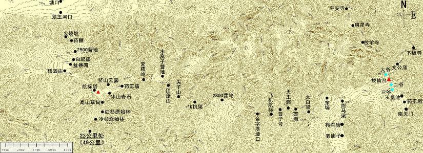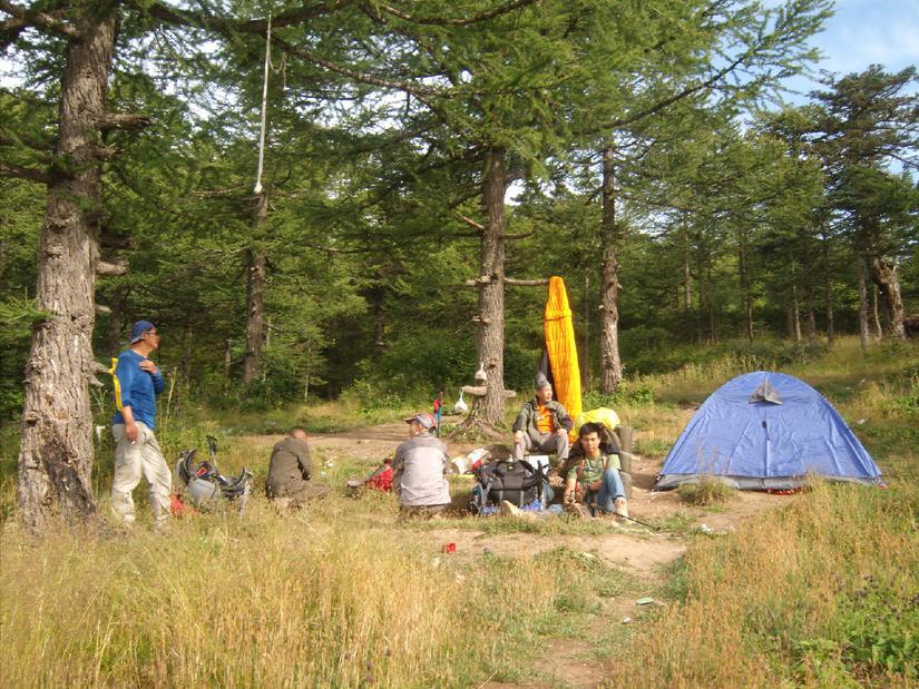 顺山梁走左下过草甸树林,东源营地和2800营地,地形非常的相似,两山之间大的马鞍接合部,两边树林中间草甸,树林旁就是营地和水源,我在水源边一直等到安徽疯子的到来,疯子胃病两天不能吃东西,只是喝水坚持着,给他说剩下的路就好走多了,到了大爷海沿景区路到下板寺方向,直接坐缆车或是小公交下山出汤峪沟就行。