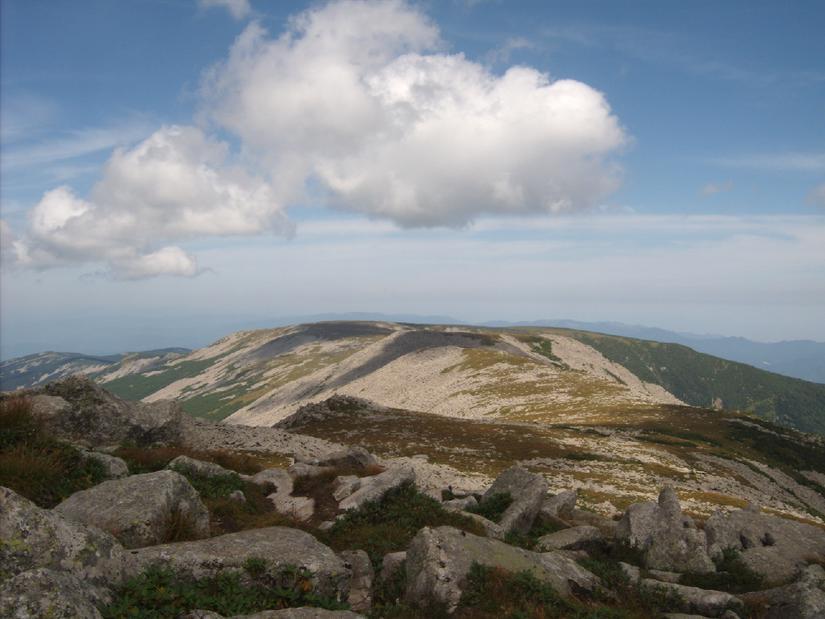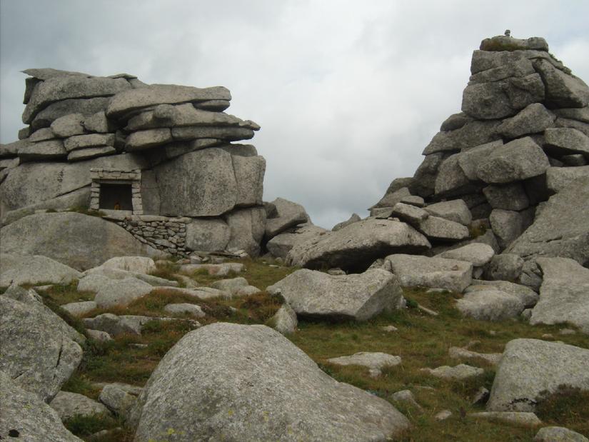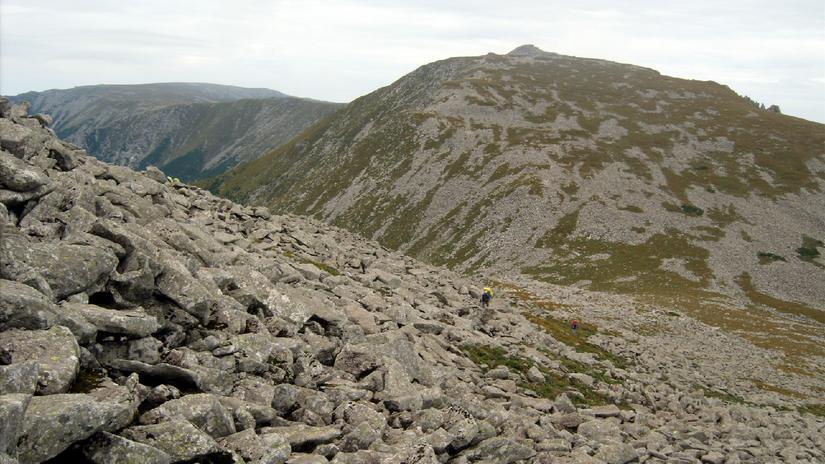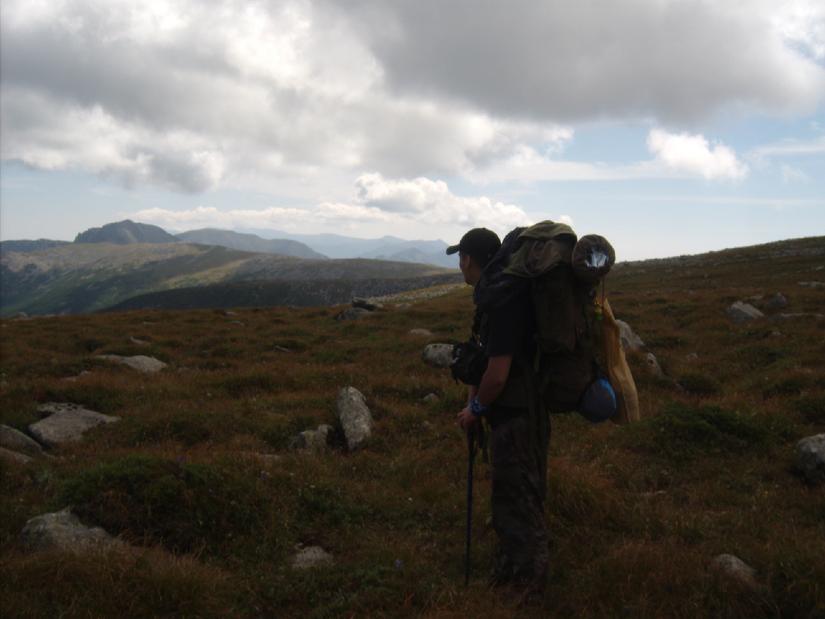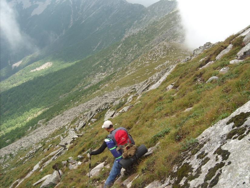 26日多云,一早收拾装备,紧挨营地东侧就有一条小路上山。一下就是几百米拔高,气喘的厉害,和平时不一样,可能是氧不够用吧。打火机点烟都点不着,到顶后顺山脊走,方向偏东,没有岔路,路过一座驴友的墓地,估计是衣冠冢吧,走一段开始几百米的下,下了在上,过山车一样,飞机梁和金子塔梁,几乎都是这样的路,起起伏伏,石海石河多,也是鳌太全程强度难度最大的两段路。