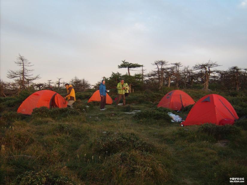 昨夜下了一场短暂的大雨,林子里湿露露的,空气湿润,我和山东的几位驴友走在最后,走走停停,停停走走,后边不断有队伍超过我们,他们有的是昨夜扎营在山下的队伍。过了广告牌和警告牌,一路继续向上,几乎没有岔路,路迹明显,这时看见下来接我们的渔夫老兄,前队早就到了火烧坡了,简单吃了点浙江渔夫老兄坐的面条,把人等齐。继续上行,不到2900营地,西安须菩提老弟下来接我们后队,前队早已到海拔3200的盆景园扎营了,最快的三个《两男一女》直奔海拔3476导航架扎营去了,在这里再次感谢两位仁兄,不是小样的,是好样的。