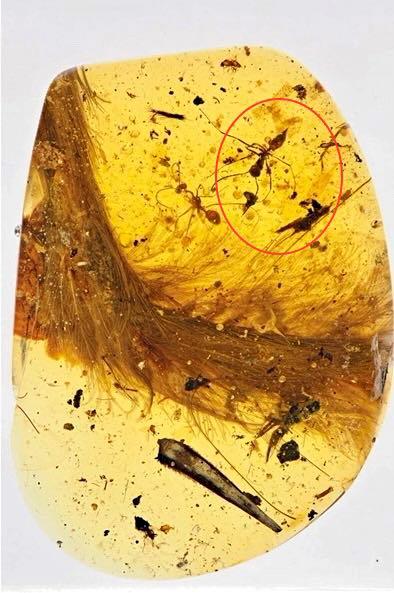 恐龙“尾巴琥珀”近距离观察大图,我用红圈圈上的是那两只蚊子
