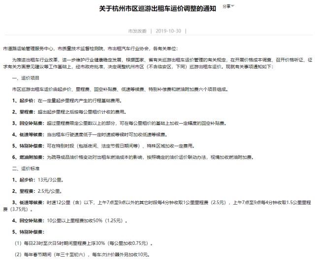 12月1日起杭州出租车起步价上调至13元