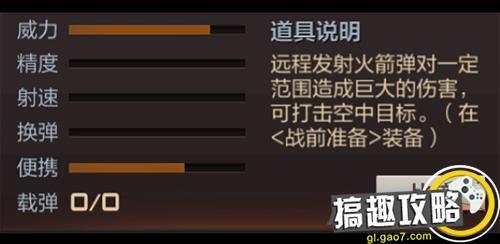 远程发射火箭弹对一定范围造成巨大伤害,可打击空中目标。(在<战前准备>装备)。