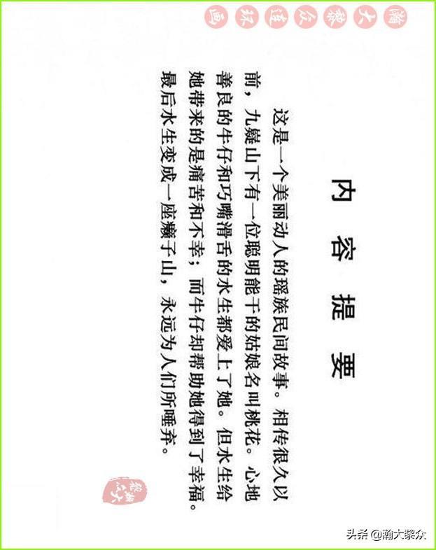 内容提要:这是一个美丽动人的瑶族民间故事。相传很久以前,九嶷山下有一位聪明能干的姑娘名叫桃花。心地善良的牛仔和巧嘴滑舌的水生都爱上了她。但水生给她带来的是痛苦和不幸;而牛仔却帮助她得到了幸福。最后水生变成一座癞子山,永远为人们所唾弃。