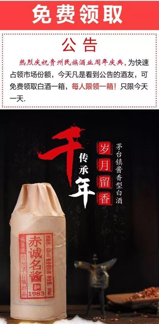 “热烈庆祝贵州民族酒业周年庆典,为快速占领市场份额,今天凡是看到公告的酒友,可以免费领取白酒一箱。每人限领一箱,只限今天一天。”近期,一则“免费领取”茅台镇53度白酒的广告从新京报记者浏览的页面上弹出。