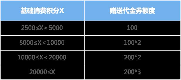 金鹏俱乐部会员搭乘符合奖励规则的航班及舱位,累积基础消费积分达到指定额度赠送自营在线渠道代金券,消费越多,奖励越多,最高奖励3张面值200元国内机票代金券。