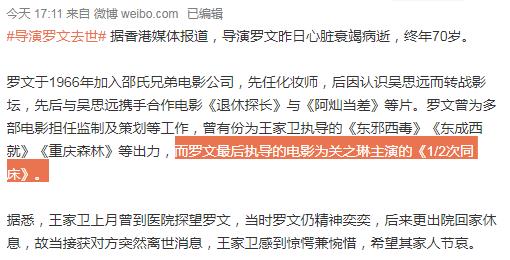 70岁导演罗文因病去世,生前最后一次为关之琳刘德华执导影片