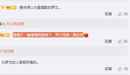 罗文去世的消息传出后,有网友表示,港圈又一颗璀璨明星落下,罗文导演一路走好。还有网友评论说,拍的电影真的好好看,都是我童年的回忆。