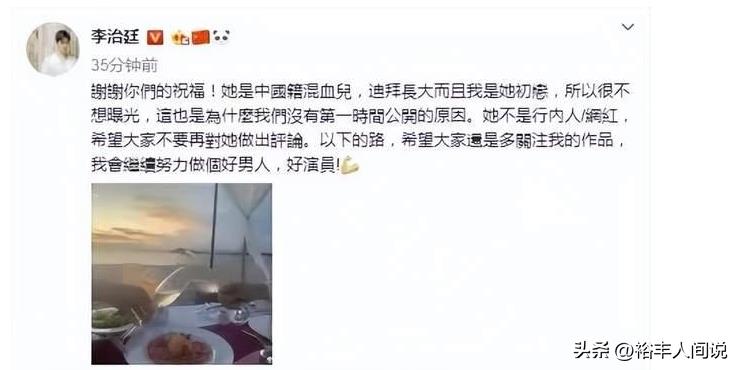 据悉,李治廷早在2019年的时候就曾大方承认过这段恋情,并表示:对方在迪拜长大,而且是他的初恋,所以不想曝光。