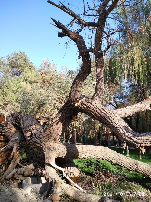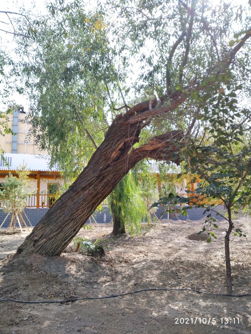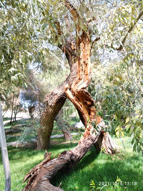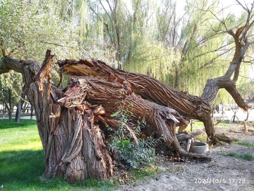 今天,在哈密人民公园内见到了左公柳,但是否是150年前左宗棠亲手所植已无从可查,但见一棵棵包含年轮,深之又深花纹的左公柳,诉说岁月如梭,曾经的沧桑;硕大的身躯,已支撑不住自己的身体,但它依然顽强挺立着,在讲述着曾经经历过的风吹雨打。