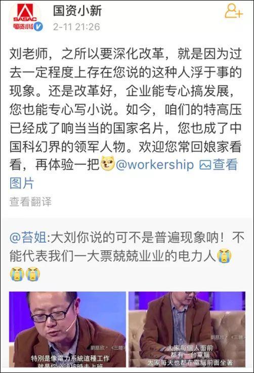 11日晚,国务院国资委新闻中心官方微博@国资小新转发了这条微博,并对此进行了回应:之所以要深化改革,就是因为过去一定程度上存在刘慈欣所说的人浮于事的现象。国资委点名@刘慈欣说,“还是改革好,企业能专心搞发展,您也能专心写小说。”最后,还表示欢迎刘慈欣常回娘家看看,“再体验一把”。