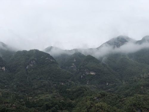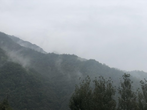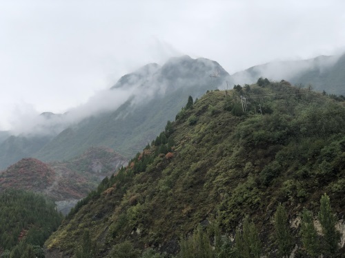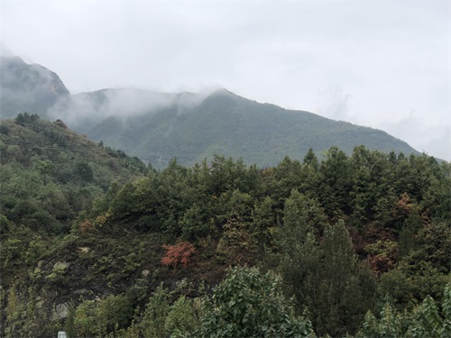 再上到高速,雨显然小多了,风景也更清晰了。意外的是,红叶,不知道什么时候已经开始出现了。这布满绿色丛林的山峦,在乍现的红叶点缀下,美得令人惊诧。远山、云雾,这不就是仙境吗?