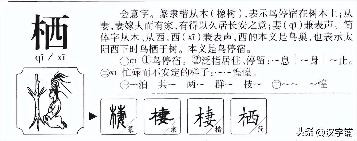 “栖”,初见于商朝甲骨文中,会意字,表示鸟停宿在树木上,后来陆续在金文、楚系简帛、秦系简牍、说文中发现,“栖”字简体版的楷书从秦朝小篆演变而来。“栖”的字源演变图如下: