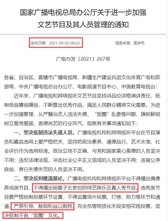 9月2号,国家广播电视台总局网站发布《关于进一步加强文艺节目以及人员管理的通知》一文,提出了一系列关于文艺节目的整改措施。