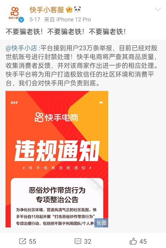 后来,有快手内部工作人员发言称,殷世航的账号被封禁23万天,即630年。
