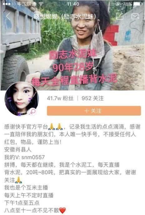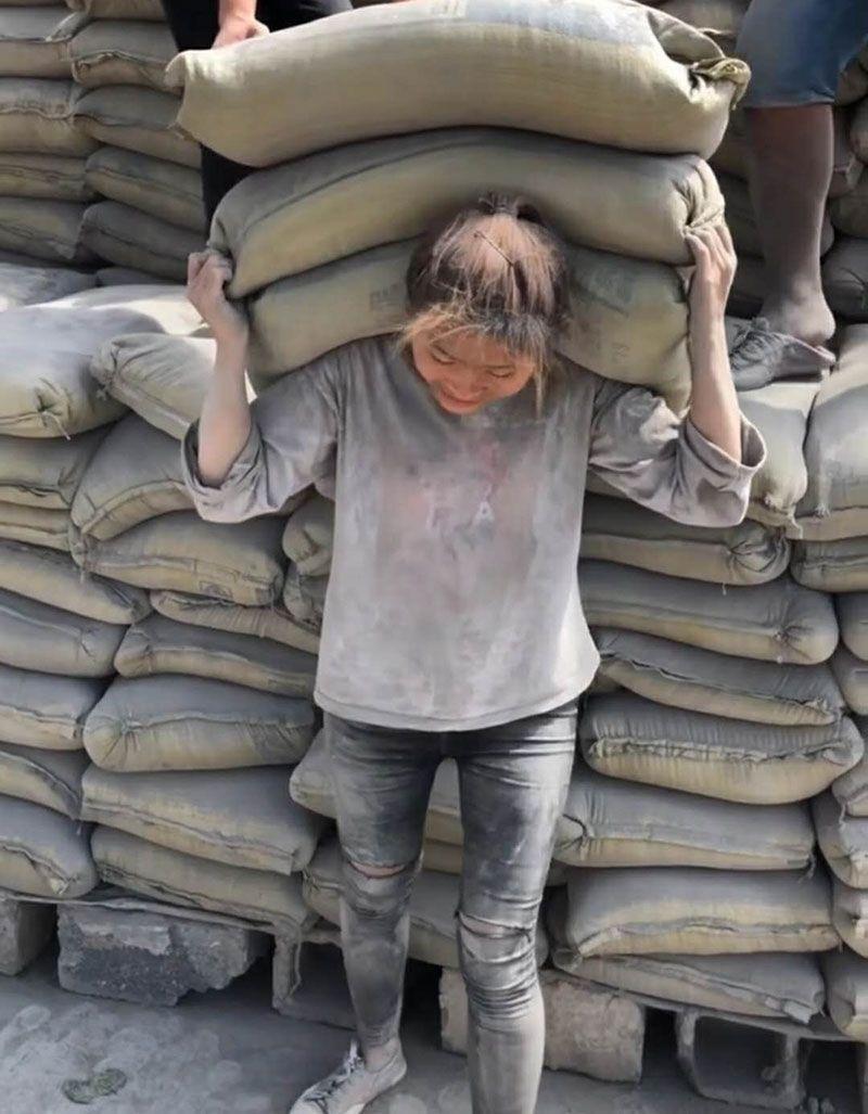 她曾在自己的直播中表示,为了多赚钱,她每天扛96吨的水泥。