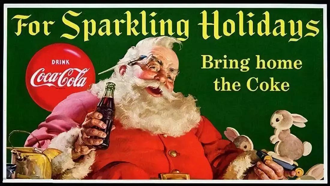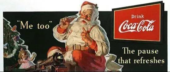 △可口可乐公司面对冬天里不断下滑的业绩,为了蹭圣诞节的热度,与瑞典商业艺术家哈顿·珊布签约,为其节日营销创造一个喝可乐的圣诞老人形象。就这样圣诞老人变成了一个面部憨态、笑容可掬,红圆滚滚的手拿可口可乐的形象。