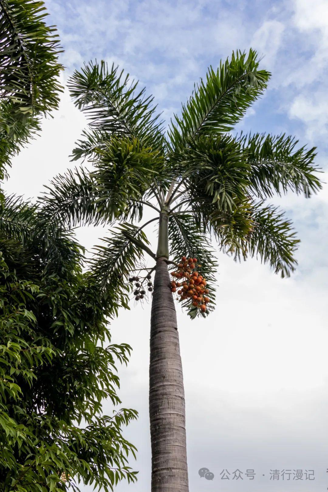 然后折向东,向海南大学走去。路边看到树干像椰子、叶子像槟榔、有红色的果子,查询后发现这叫“圣诞椰子”,棕榈科植物,因果子12-1月变红,被称为圣诞椰子,长得像槟榔,也不知道能不能吃。