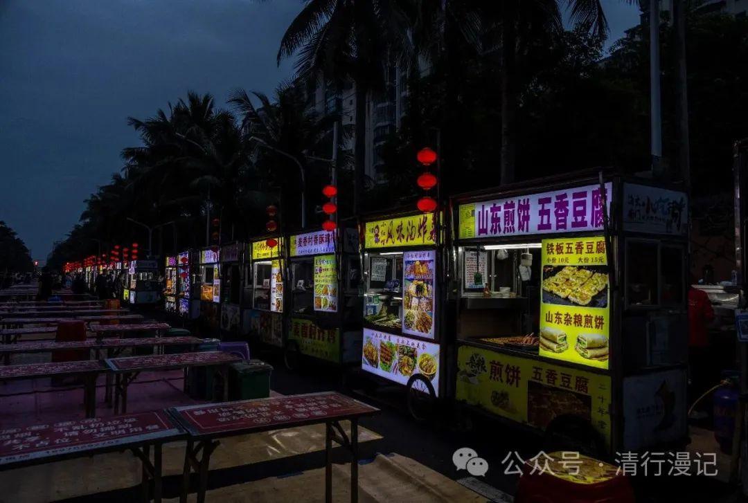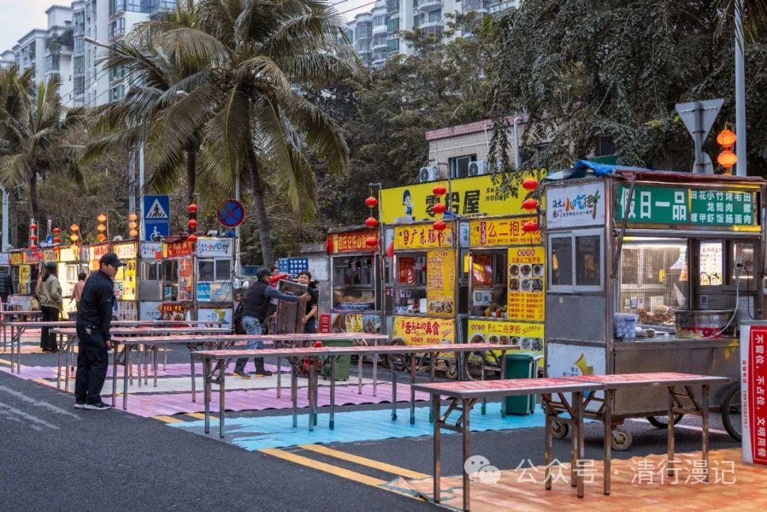 从下午5点半开始,陆续有商家推车前来准备经营,路边有一溜小箱子,里面有燃气管道,商家接上就可使用,很方便;也有一些使用煤气罐的。下午6点封路,商家麻利地打开桌子、椅子,迅速布置好,夜市立即成型了。