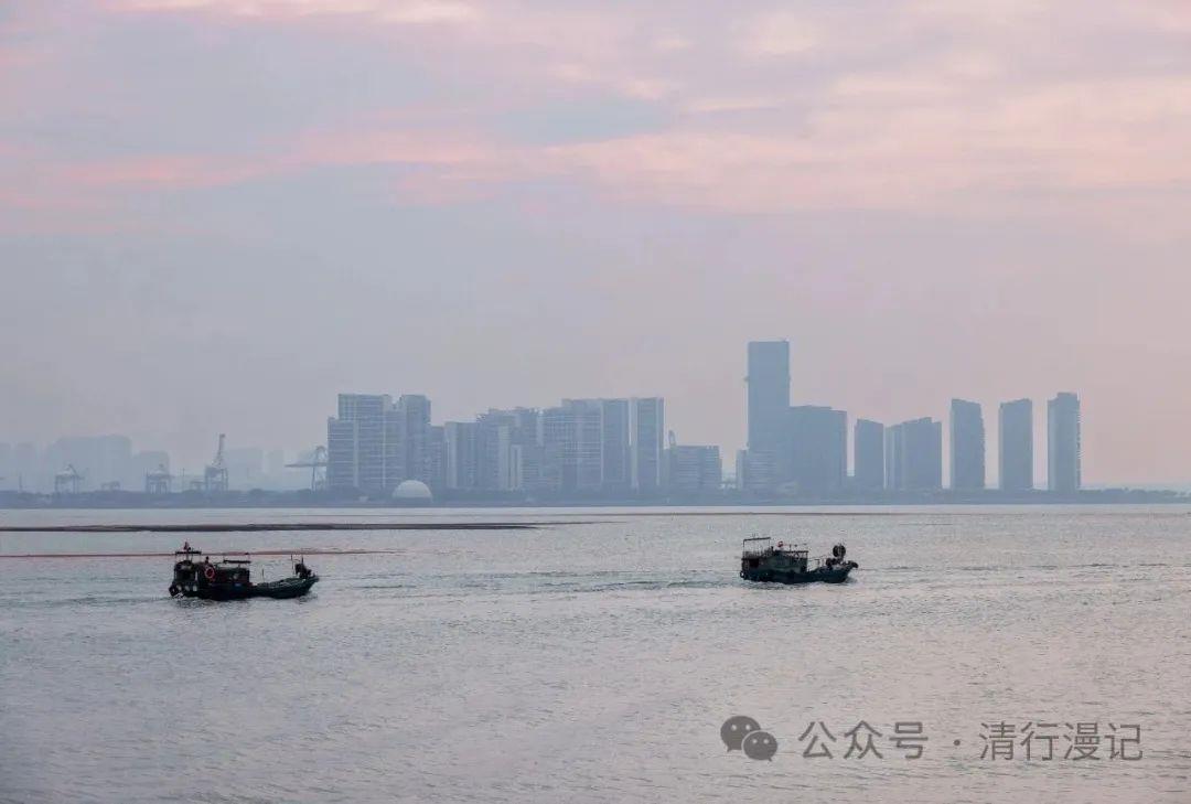 过桥后,我们先沿河边栈道向西,路过海警的码头,观看货船出海。