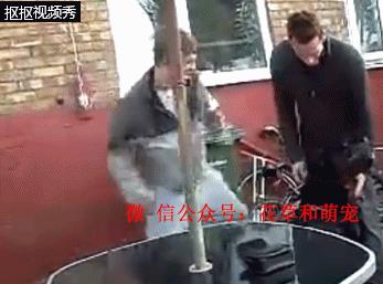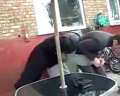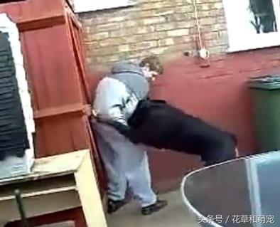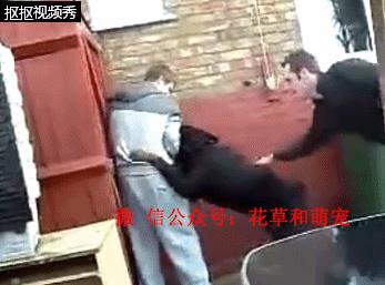 罗威纳犬这下毛了,立马从后面抱着男子,要男子放开自己的主人。